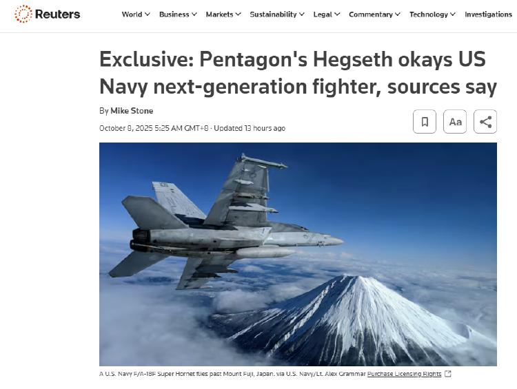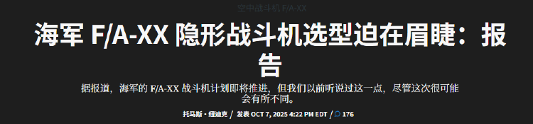 但非常有意思的一点是,无论是路透社,还是美国“动力”网站“战区”频道,都直言美国海军此举是迫于中国六代机的压力。甚至后者说得更直白——随着中国迅速开发更先进的第六代战斗机设计,其中一些改进型号最终可能会演变为航母舰载机,“美国海军面临着不能落后的压力”,要求继续发展F/A-XX的呼声越来越高。